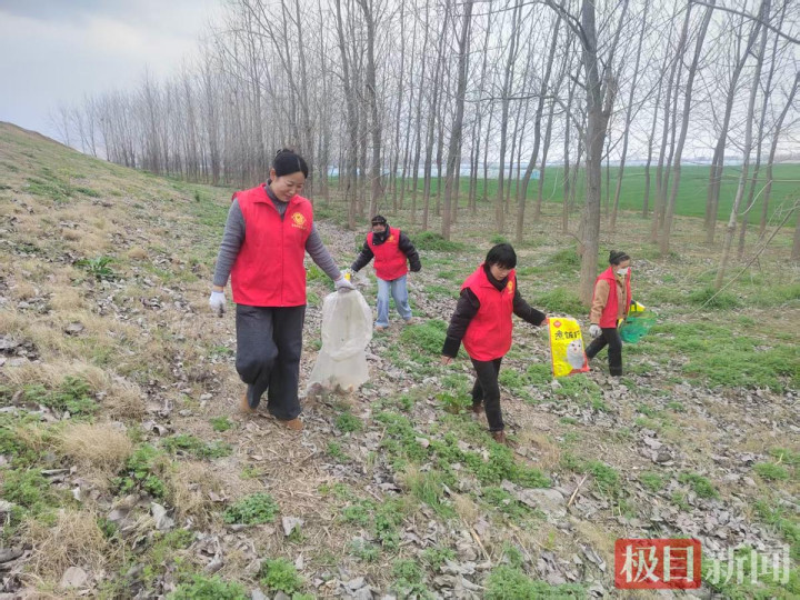 潜江市园林街谈袁桥社区的志愿者们在东荆河大堤沿线算帐垃圾。