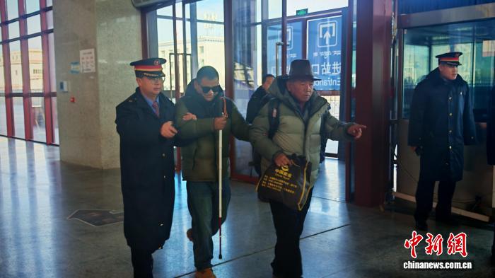 图为日喀则站客运使命主说念主员帮扶盲东说念主进站候车。拉萨车务段 供图