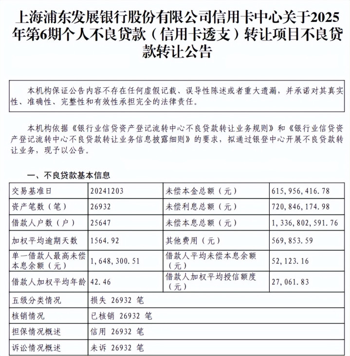 事实上,信用卡不良贷款的治理才是浦发银行的重心,2025年6月,公司一次性表现第6期至第9期信用卡透支不良贷款,未偿本息总和永诀为13.37亿元、11.71亿元、12.43亿元、5.42亿元,总共约42.93亿元。