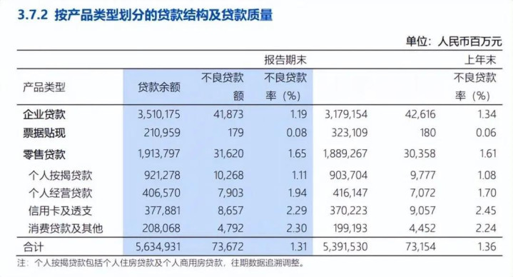 零卖贷款中,个东谈主按揭贷款、个东谈主筹画贷款、滥用贷款偏执他的不良贷款永诀102.68亿元、79.03亿元、47.92亿元,较岁首均有所飞腾,对应的不良贷款率永诀为1.11%、1.94%、2.3%,雷同较岁首有所飞腾,而信用卡及透支的不良贷款86.57亿元,不良贷款率2.29%,较岁首均有所下滑。