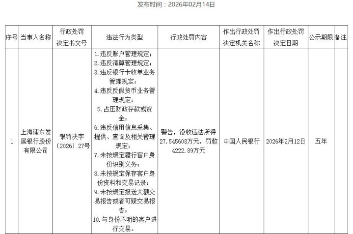 2月12日,浦发银行领多量罚单,因存在违背账户经管规则;违背计帐经管规则;违背银行卡收单业务经管规则;违背反伪物币业务经管规则;占压财政入款或资金;违背信用信息网络、提供、查询及相干经管规则;未按规则现实客户身份识别义务;未按规则保存客户身份贵府和往来记载;未按规则报送大额往来敷陈大略可疑往来敷陈;与身份不解的客户进行往来等违法事实,被中国东谈主民银行警戒,充公违法所得27.545608万元,罚金4222.89万元,公示期限为5年。