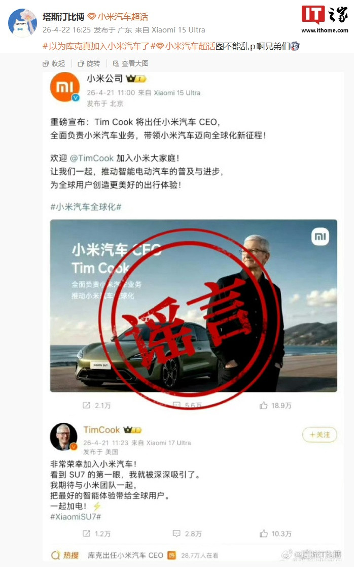 开云app下载 库克将出任小米汽车CEO?小米高管回话