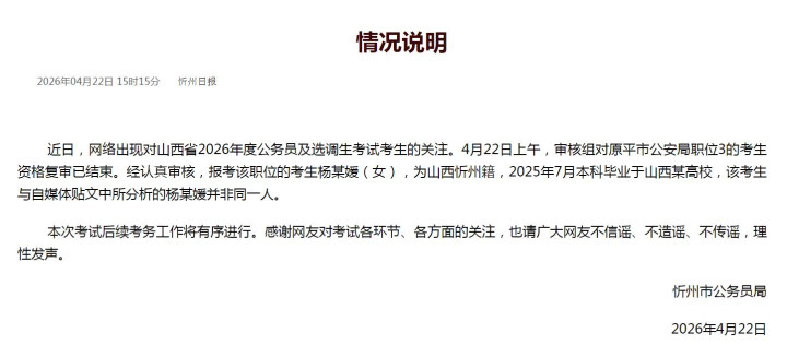 近日,集聚出现对山西省2026年度公事员及选调生检修考生的柔和。4月22日上昼,审核组对原平市公安局职位3的考生经验复审已终结。经肃穆审核,报考该职位的考生杨某媛(女),为山西忻州籍,开云2025年7月本科毕业于山西某高校,该考生与自媒体恤文中所分析的杨某媛并非并吞东谈主。