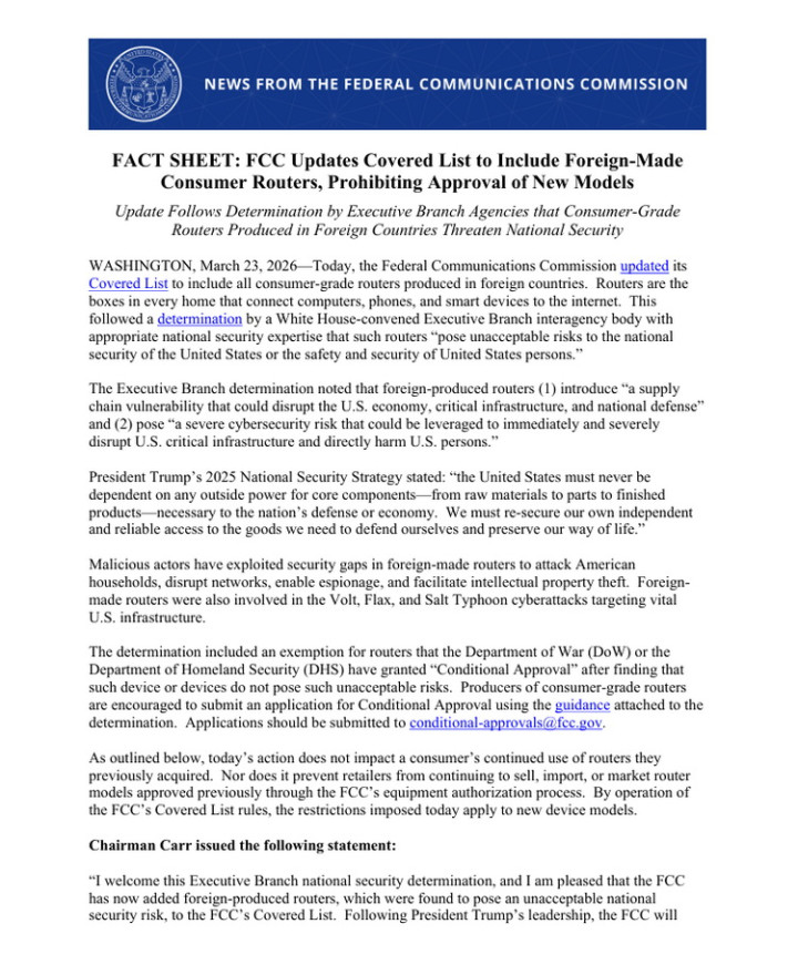在旧年12月,好意思国联邦通讯委员会(FCC)将通盘异邦制造的新式无东说念主机以及关键零件列入受不休清单,不容入口以及销售。当今好意思海外坐褥的破钞级路由器也享受同恭候遇了,FCC以挟制好意思国国度安全为由,不容认证新式号,至极于无法在好意思国销售新品。